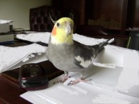 Lost in Lake Riviera section of Brick, last sighted on Vermont Drive near Birch Bark Drive on 10.20.13. Answers to Birdy, Bird Bird and Bur Bur. He may call out Erma! Erma! when he sees you. He is gray with white on wings, yellow head and orange cheeks.
