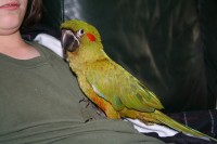 Penelope is a one-year old red-fronted macaw.She got away in our backyard. Her wings have always been clipped, but they must have grown out too long. She is very friendly but probably very hungry and scared at this point. She is banded, and we know her band number for identification. She now has more red over her beak than in the photo. She has orange under her wings. Her chirp is very loud. She has been around the same neighborhood in Haddonfield for the last two days, near Christ the King Church and Hopkins Avenue. She doesn’t know her name but will respond to our whistle.
