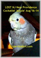 “Aussie” flew away from her New Providence home around 3pm on Sat., August 16th. She is a grey cockatiel with a crested head, orange cheek patches, dark grey plumage and white on her wings.