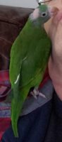 Canary Winged Bee Bee, Brotogeris. Answers to Boris. Lost feathers on head and neck. Band starts with AE. Owner can supply full band number.