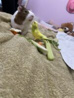 Yellow and green parakeet named tweety she is very friendly with other animals.