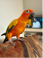 Maui is a sun conure that is mostly orange, with yellow and green wings. He screams extremely loud and has a tendency to land on people’s heads. He has a crack on his beak and pinkish feet.
