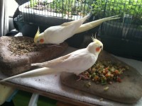 mostly white, with yellow face/crest and orange ears. very friendly.