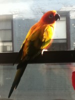 Top of his head to his breast is red and orange, his wings are yellow, blue and green. He is small. He has a silver ring tag on one of his feet. Black beak. High pitched squawk.