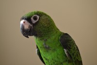 Dino is a green Jardine Parrot that has a pink nose black beak. He says the words whatsup and Mujtaba. He whistles alot. He loves eating almonds, especially ones that are in shells. Isnt at all harmful. Underneath his wings there are patches of red and orange feathers.