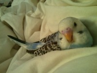 Hopefully someone can help us find / return our beautiful young parakeet/budgie named Falcon. He flew out of his cage around 9AM during a water change and has been MIA since. 🙁 This picture was when he was still a baby but the only difference is that his cere (color of nose – nostrils) is a dark blue – indicating he is a boy!) and his beak is slightly darker tan than orange but he can also be identified by a patch of white just of center on the back of his little head. He’s smart and might step up on your fingers if offered – but I cannot be sure because I’m sure he’s terribly frightened. He’s normally very friendly, does not bite hard at all – he likes to nibble and he responds to chirpy coos of ‘Hello!’ and ‘Who’s my cute little BUD-GIE?’ Yes, we absolutely spoiled him rotten and he would perk up when he heard a cheery voice – usually female. He also might respond to ‘Little Daddy’ or ‘Chiquito Papa’ in spanish as he looks very much like his daddy. If anyone can PLEASE let us know if they know his whereabouts of if they have him we would be ETERNALLY GRATEFUL! He might need some medication as he was recently exposed to another bird who passed away this weekend we believe that’s probably why he escaped – thinking he left too. 🙁 He was heartbroken because it was his best friend.