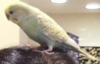 Belle is incredibly friendly. She is yellow and light green, with purple cheek marks. She will seek out any human she sees and will attempt to land on their head or shoulder.