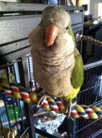 Olive is a 4 year old green and gray quaker parrot. She managed to escape her carrier while on her way to getting her wings clipped. She is fully flighted. She has a small vocabulary but often says things such as hello, good girl and come here. She likes to mimic laughter, whistling, coughing and clapping. She has a great personality but can sometimes be stubborn. She does not have a bracelet. We give her a great home and love and miss her very much.