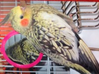 She is a grey cockatiel with yellow spots. Not finger trained, but will fly to your should. She doesn’t bite. 2 yrs old. Answers to ‘Baby’