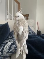 Light beige/gray with white specks on his wings and back. Has a distinctive dark strip on his beak. He is very friendly if he doesn’t feel threatened or scared. Sesame loves to land on people’s heads and shoulders. He is somewhat recall trained, knows his name.
