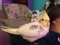 He flew off my should up over the roof at my house he got startled. I never should have been outside didnt think he could fly. He’s a baby he’s only 6 months old I’m DEVESTATED. I thought his wings were clipped. I will give some one a reward. Please contact me. Thank you. His band is purple. And the grey on his wings look like a tattoo in both sides. He whistles and sings and bobs his head. He’s very calm and sweet. Thank you.