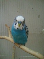 Normal looking blue parakeet/budgie. Very attracted to the sound of a bell. Fairly long beak. Will jump on finger or shoulder if given a nudge or if hungry.