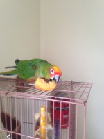 Maria is about 3.5 years old. She’s a gold capped conure. Her natural sound is a high pitched shrieking which she does most often when she excited or scared. She also mimics beeping a of things like the microwave and smoke detector. She usually responds with her shrieking when someone calls her name or whistles for her. She is about 5-6 inches tall and 8-10 inches from head to tip of tail. She is unfamiliar with the outdoors and flying so is most likely very confused. She is friendly of you were to see her walking or at your bird feeder she would probably get on your finger. She loves fruit especially peaches, oranges, and strawberries. She also loves peanuts. She has a mostly green body with a red chest and her head fades from red to gold. She also has blue at the tip of her wing and tail feathers. She flew from Mosser dr on the 20th. Please call or text 419-705-3115 or email hallieswanson1993@gmail.com with even the smallest bit information. Thank you