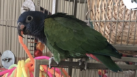 Sky has a blue head and green body. She has a loud squawk that she does back to back.