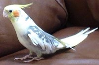 White belly and back with grey markings on back. Orange cheeks, yellow crest. Two years old. Sings the Andy Griffith theme song, wolf whistles and says Step Up and Pretty Bird Neo. Lost in Loveland, Ohio. If found or spotted, please call 513-235-3330