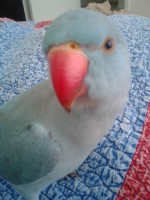 Lost Indian Ringneck, light blue with purple band on left foot. Pale blue, orange beak