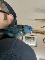 Coby is a gentle, cobalt blue lineolated parakeet. She is very friendly towards humans and will gladly perch on your finger or shoulder.
