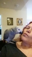 she is 1.5 years old and is just beginning to make all kinds of noises and words. she loves clicks with the tonge and kissey noises and will ‘step up’ when told to.