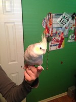 Carlos is very friendly. Ask him to step of an offer him a finger at his chest, and he will jump right up on you. He loves cheerios and millet.