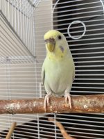 Pockets is has light yellow head and light turquoise body. She is friendly.