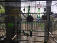 Pale yellow parakeet with light pale green on tummy and outline of feathers on wing. She has a blue and purple mark on her face. She is the one on the y perch in the picture above
