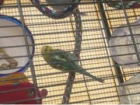 Female Budgie mainly green but has blue on her lower belly, not really a lover of people