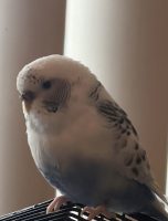 We’ve had her since she was a baby parakeet. She’s a white budgie with a blue belly and black spots on her wings.