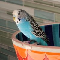 Daisy is a 3 year old Blue and White Parakeet with a regular black and white wing pattern and solid blue chest.. She is skittish but may come to food or toys with bells. She is very small in size. Has leg band.