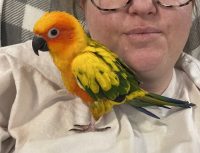 Lucy is a friendly sun conure, with speckled green throughout her yellow flight feathers and a green leg band. She flew out of the house on Sunday, 10/6, and was in a neighbors tree all the night as she flew off as the sun was going down. I sat outside and called to her all night, and she responded. The morning of 10/7, she flew northbound and we could hear her calls but when animal control and an arborist came to assist in a rescue, she couldn’t be found. Please contact me directly at (303) 513-7170 with any information that can lead to her safe return home.