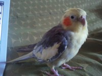 Type of Bird: Standard CockatielColors: Yellow head and crest, Orange cheeks, Gray body (also one of the wings have been clipped)