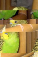 Daggmar is a male, bright green and yellow parakeet with black stripes and a blue dash on his cheeks. He has a band on his right leg.