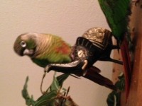 She recently had her wings clipped but could still fly a little to high. I was about to go get her clipped and my other one but waited too late. My other bird (gcc) is Kiwi. She was a very jealous bird and always wanted the attention any time I tried to be with Kiwi. She loves to be held. Instead of “up up” on my finger she prefers doing it on my thumb then I would hold her like that, cradling her back in the cup of my hand. She has light turquois on the back of her neck and her underwings are turquoise. She was sold to me from a breeder as a Turquoise GCC. I have contacted my breeder also but unfortunately she has no record of the band numbers. The band is silver..