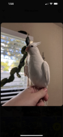 Albino Cockatiel, all white. Long, long flight feathers. Tail feathers almost look like a swallowtail when she flies.. Deep red/ maroon eyes.