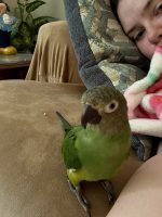 Parsley is a dusky conure – mostly green with a grey head and black beak. He is very friendly and knows his name. He will step up on your finger if you offer it to him but will be spooked if you try to grab him with “claw” hand. He whispers “kiss-kiss” though it sounds like “ki-ki” or “kith-kith”. He is very loved and missed and we just want to bring him home