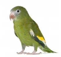 Small, thin green parrot, about 7 inches. Has yellow “trim” on wings when folded, and some white wing feathers apparent when in flight.