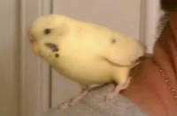 Baxter-female, yellow with blue cheeks, block spots under cheeks, green back side. Finger trained, tame. Very curious. Flies to shoulders and head.