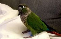 Loki is a Green Cheek Conure. He answers to “Come Here” and Kiss noises. He is friendly and may fly down to greet you, often landing on a persons head or shoulders. He loves banana. He has a bright red patch of feathers at the very front edge of his left wing. Has not been sexed so may be female.
