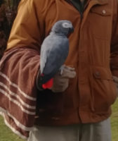 Feathers is about 3 1/2 years old. Responds to step up. All grey male with red tail feathers. Not friendly towards others. Has a leg band. Can’t remember if chipped. Very loved and missed. Sorta on the fluffier side.
