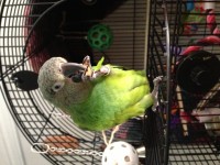 Perry is almost 2 years old, and is semi-tamed. He just grew his wings back in so he is a little rusty in flying. He makes high-pitched squawking noises.