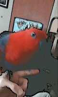 Beautiful red sided female eclectus, very hand tame and knows to step up, or ” Up, Up”.