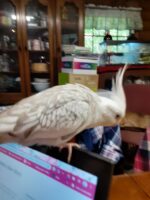 He comes to Stormy, come here Stormy, pretty bird, and baby. He is sweet but very scared. And is due to have wings clipped so have had a hard time trying to catch him and now he is lost.