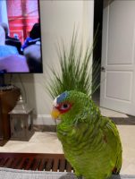 Kiwi is a white fronted amazon. He is familiar with his name and usually responds when you call him. He is partially finger trained. He knows how to say come here, how are you, hum hum hum (we say this when we prepare his food).