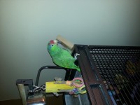 Penny is friendly and does not bite. She talks a lot and will call back if you say hi, what a good bird, what are you doing. She will step up if told to. Penny is sweet but does not like to be pet on her back.