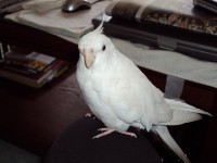 He is very friendly and whistles and sings. He is a cockatiel but does not have the typical orange markings. He is an albino. Ollie is 4 years old and has a red leg band.