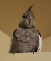Friendly and flighted with bald spots on her chest and tops of her wings.