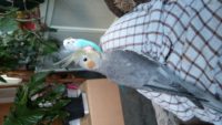 She flew out the door about 6 PM on July 12, 2017. She is only five months old. She is mostly gray with a spot of white on one side of her head. I am offering a $50 reward for her safe return.