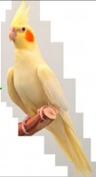 My yellow cockatiel bird (small parrot) flew out of his cage when I was cleaning it earlier today. He is bright yellow in color, has a yellow crest of feathers on top of his head, has orange spots on both cheeks, and has a slightly gray tail. He is about 8 inches tall, 12 inches including feathers, and has a very distinct loud chirp and can also whistle and trill.