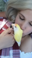 My baby is a boy, he’s very sweet and friendly. He is a tamed bird he is also very smart and he loves attention. He’s 3 years old yellow, white and a lil bit of orange in he’s for head.