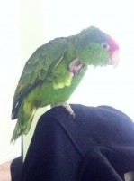Lost Chico from El Monte in December 2013. Says Hello, has pink-purple band on leg, does cat call whistle. Mexican Red head Amazon. Green, with red head, with Blue temples.
