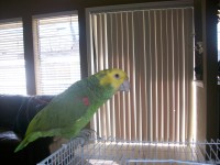 He is not tamed! so be carefull when gabbing or touching him. He knows how to say “hello” “holla” and, ”Oh well”. He squeeks like a rubber duck and screem real loud.